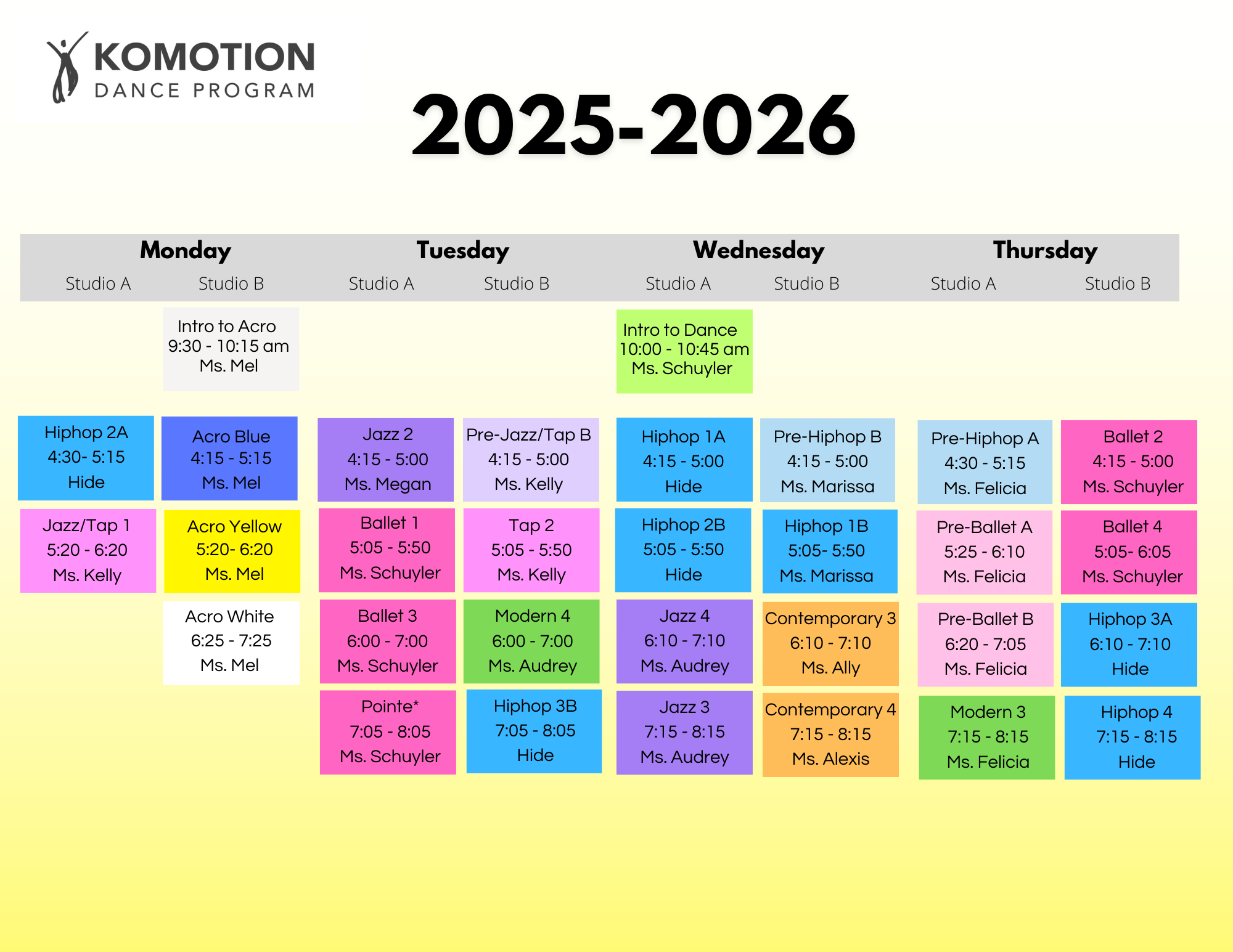 Classes offered include: Ballet, Pointe, Hiphop, Jazz, Contemporary, Modern, Tap, and Acro.